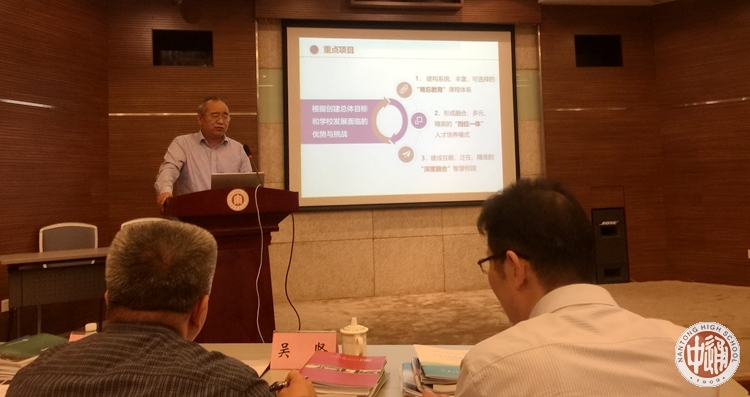 成锦平校长从现状分析、创建目标、重点项目、保障措施等方面,汇报了我校高品质示范高中的创建思路,特别介绍了“建构‘难忘教育’课程体系”“形成‘ 四位一体’育人模式”和“建成‘深度融合’智慧校园”的具体任务和项目推进策略。