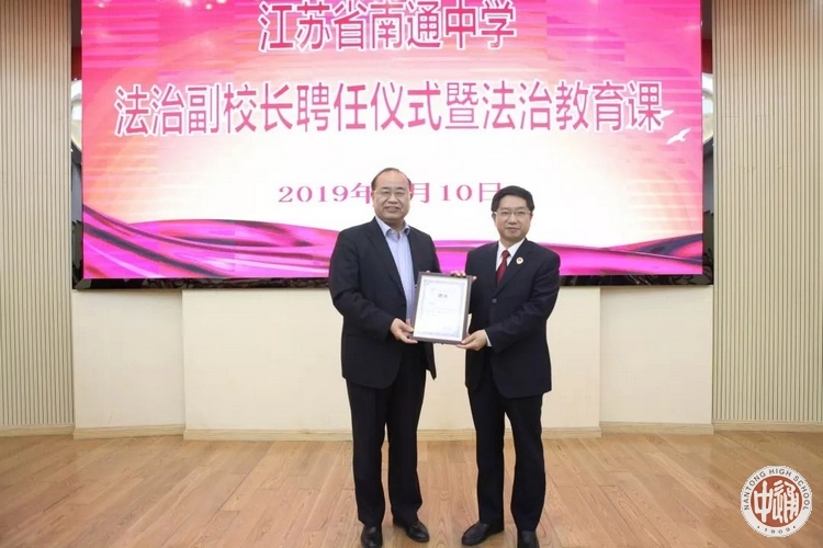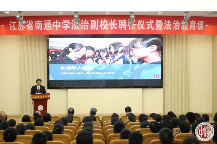 5月10日下午,南通市人民检察院党组书记、检察长俞昕水来到南通中学,为全校学生讲授法治课。授课开始前,俞昕水检察长从校长成锦平手中接过聘书,成为南通中学法治副校长。