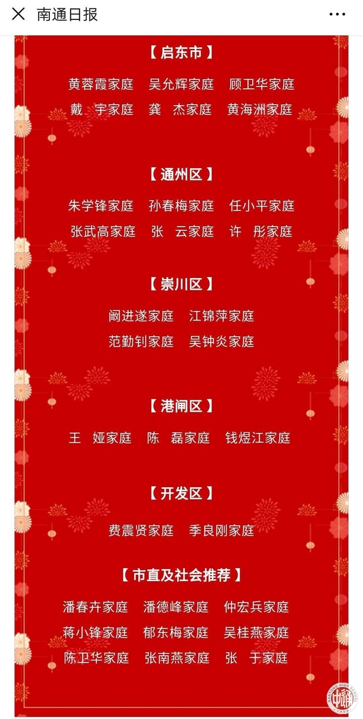 5月15日,南通市妇联“5.15”国际家庭日专场发布会举行。会上,揭晓了2019年度南通市“最美家庭”寻访结果,我校吴桂燕老师家庭光荣当选。