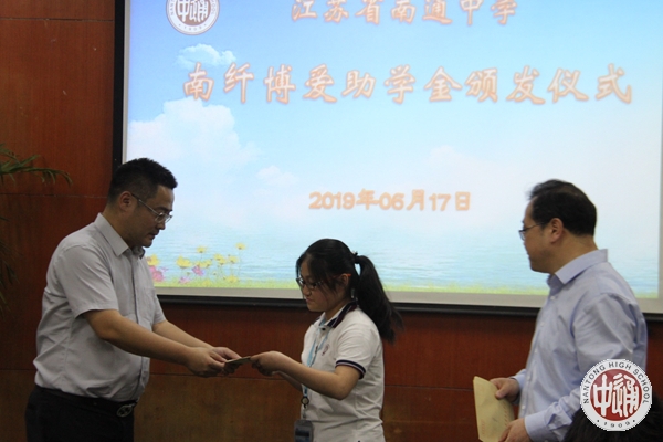 南通醋酸纤维有限公司是南通地区一家大型企业,是一个具有高度社会责任感的企业,在成长和发展的同时不忘回报社会。该公司自成立以来已投入9亿多元用于环境保护和节能减排,投入一千多万元用于社会公益事业。2010年起南纤在南通市红十字会的共同协商和支持下,在我校设立“南纤博爱奖助学基金”,并每年向该基金注入20-25万元用于对我校品学兼优的同学和家庭困难的同学进行奖励和资助。
