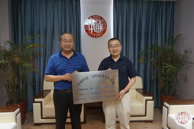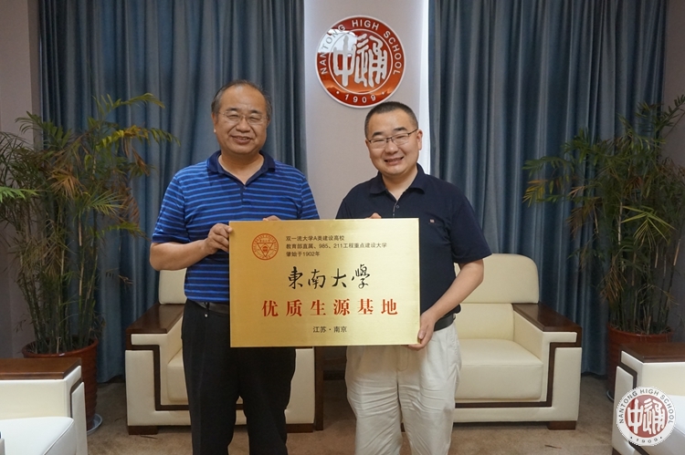 6月27日下午,东南大学江苏招生组组长、东南大学能源与环境管理学院党委书记蔡亮莅临我校,分别代表“卓越大学联盟”和东南大学向我校授予“优质生源基地”牌匾。