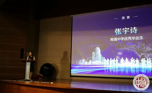 我校2015届优秀毕业生张宇诗,现北京大学法学院2019届法学本科、经济学双学位毕业生,也是北大法学院2019级法学硕士民商法方向研究生,作为学生代表发言,她说南通是一座极具活力与潜力的城市,作为通籍学子,理应有担当,有作为,凝心聚力建设新家乡。