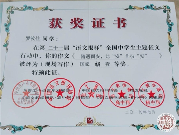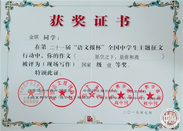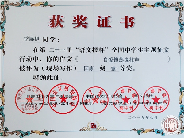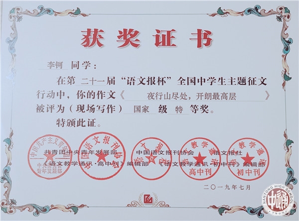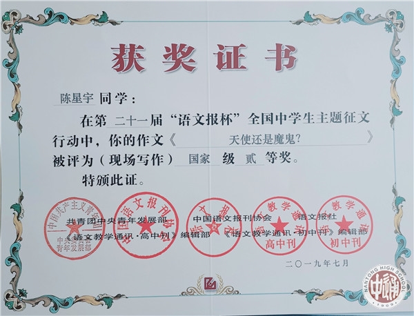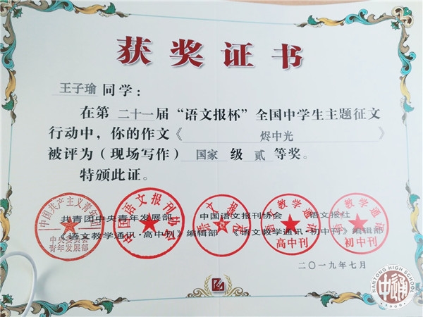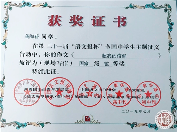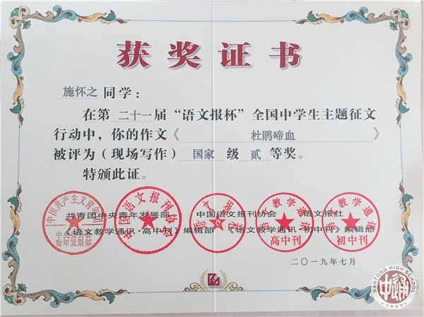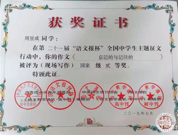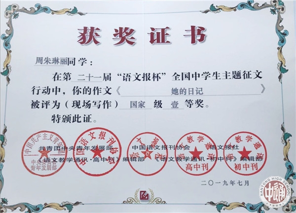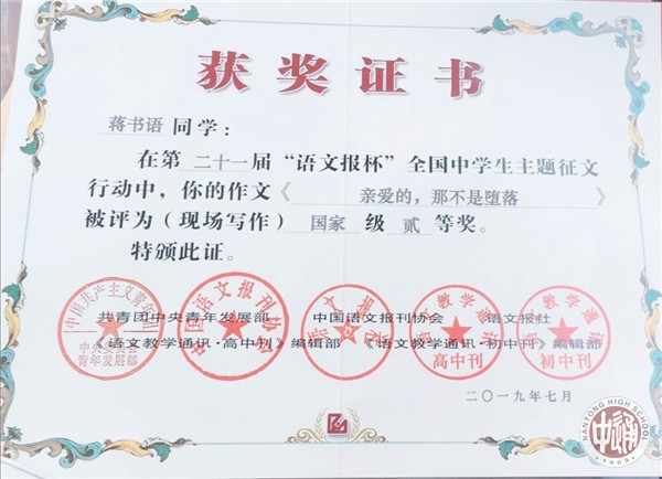 7月14日,第二十一届“语文报杯”全国中学生作文大赛现场赛决赛在浙江绍兴落幕,南通中学十一位学子惊艳亮相,成绩斐然。李钶同学荣获国家级特等奖,罗汝佳,季展伊,周朱琳丽,金琪荣获国家级一等奖,陈星宇,龚陶菥,周昱成,蒋书语,施怀之,王子瑜荣获国家级二等奖。