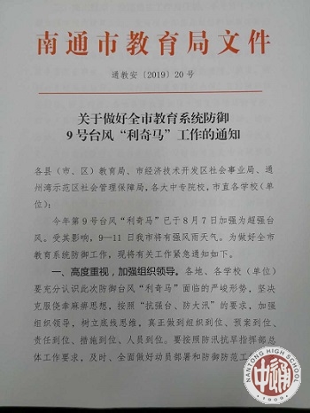 8月9日,根据江苏省及南通市气象部门的预测,今年第9号台风“利奇马”将于8月10日在浙江沿海一带登陆,登陆时中心附近最大风力有16级(52米/秒),中心最低气压930百帕,可达强台风级或超强台风级。这次台风风力强、雨量大、影响范围广、持续时间长,将给我省及我市带来大风和强降雨。