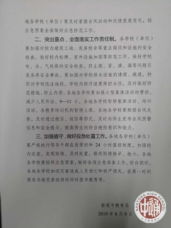 根据会议部署和要求,学生处负责通知全校学生台风期间避免外出、教务处负责通知全校教师不得组织学生进行任何户外集体活动;党政办及后勤组织学校保安及物业迅速展开校园安全隐患“地毯式”排查,对发现的问题进行彻底整改。