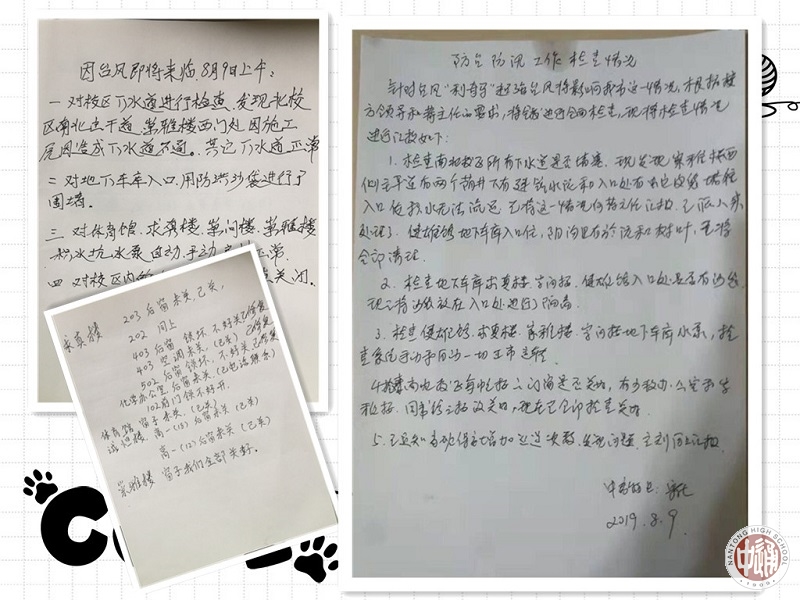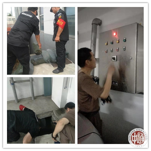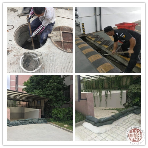 由于时间紧、任务重,学校紧急领导小组成员与保安物业等连夜加班,巡查全校所有的教室及办公室门窗,确保关闭;地下车库确保排水泵工作正常,并用沙袋垫高车库入口、高空悬挂物品全部摘取。9日夜,为了确保防汛防风工作更加细致,在完成隐患排查及整改的基础上,学校保安和物业还对工作进行了书面总结和梳理,并及时汇报党政办和分管刘校长。