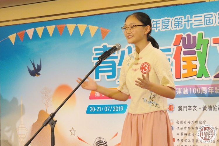 为纪念五四运动100周年、澳门回归祖国20周年和黄埔军校建校95周年,由澳门•辛亥黄埔协进会主办的2019年度(第十三届)海峡两岸“民族心•中华情”青少年征文演讲比赛于7月19日至21日在澳门举行。我校高一(4)班沈诗雨同学经南通民革推荐代表南通市参加了本次比赛。