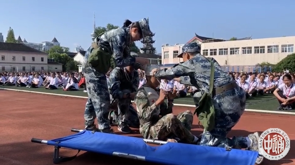 接下来战伤救护小组的集体展示。在此次军训汇报展示评比中,我校战伤救护小组最终是勇夺此项评比的第一名。战伤救护是指在战斗中对被各种武器致伤的伤员进行战地抢救治疗与护送的紧急救护过程。在这一过程中,战伤救护队员要用最短的时间救助战友的生命,同时保护自身的安全。战伤救护的流程主要包括:出发时打毛巾、口罩,通过毒气污染区到终点,将头部、胸部受伤的战友进行包扎,并且抬上担架,快速撤回到后方。