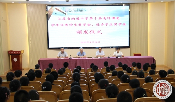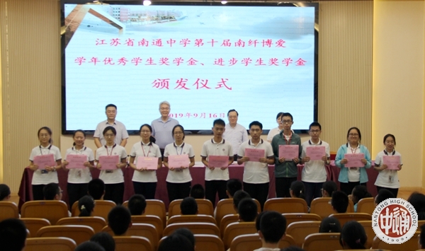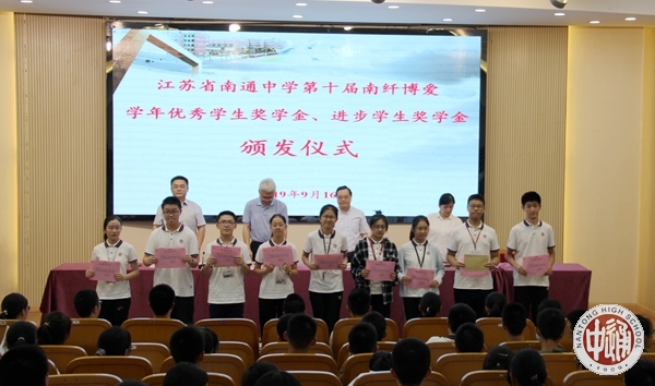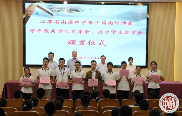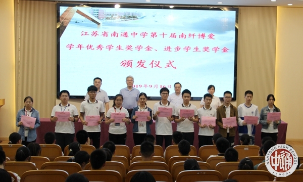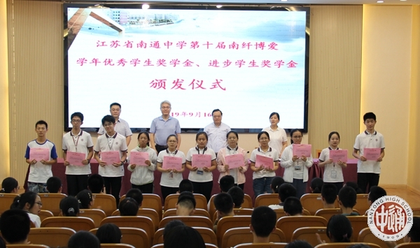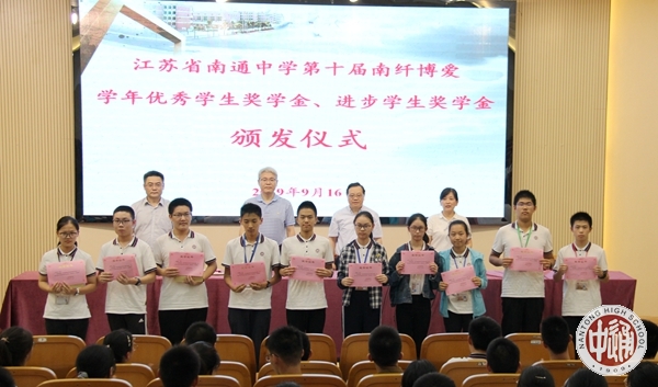 9月16日下午,我校第十届南纤博爱学年优秀学生奖颁奖活动在科学楼三楼报告厅举行。2018—2019学年度,我校学生诚于做人、恒于学问,一学年来一部分同学在全面发展的基础上,刻苦学习,成绩优秀,名列年级前茅,获得“学年度南纤博爱优秀学生奖学金”;一部分学生不畏困难,勇攀高峰,学习成绩进步显著,获得“学年度南纤博爱进步学生奖学金”。