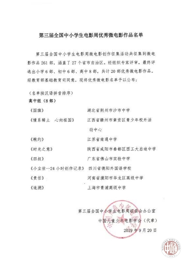 我校《楸约》获全国中小学电影周优秀作品奖 来源:本站原创 发布时间:2019-09-26 13:51:40 浏览次数: 次 【字体:小 大】 图文来源:电影网;责编:田宇龙;审核:沈惠祥 分享到: 【打印正文】