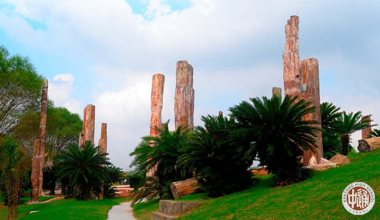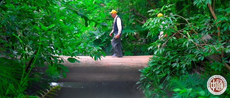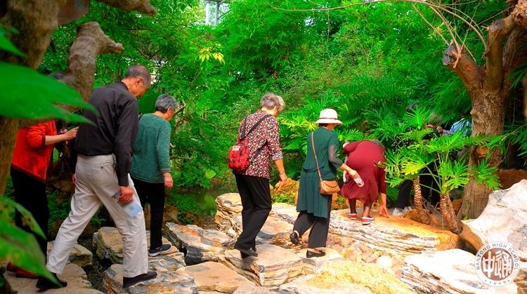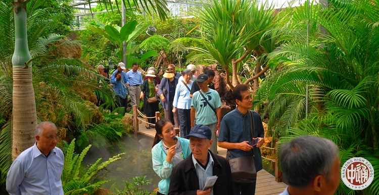 以下各图中离退休老教工们正在讲解员的引导下徒步穿越模拟热带雨林。