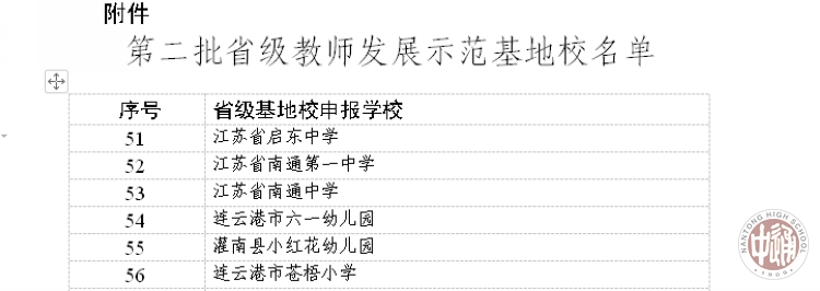 经各设区市教育局、省教指委和省师干训中心推荐,省教育厅组织专家材料评审、现场抽查等环节,近日,省教育厅公布了评选结果。根据《省教育厅关于公布第二批省级教师发展示范基地校名单的通知》(苏教师函〔2019〕23号)文件精神,我校被评为“第二批省级教师发展示范基地校”。
