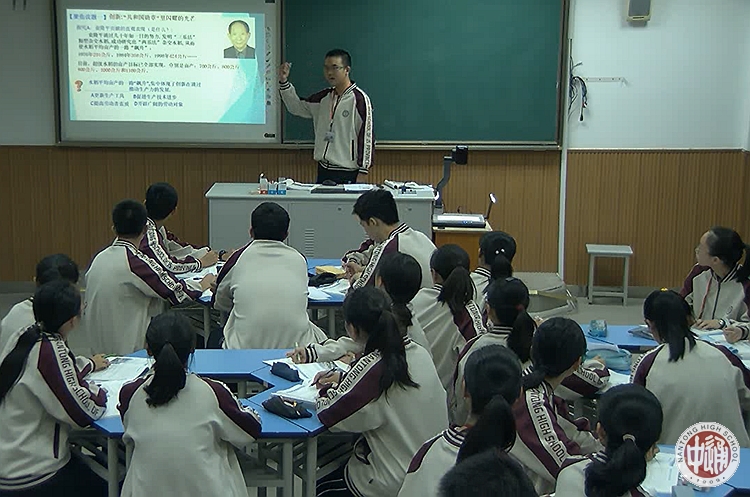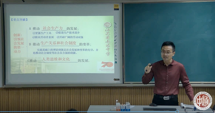 上午第二课,南通中学党政办副主任、吴建工作室成员蒋卫星老师执教示范课,培训班全体学员和工作室全体成员观摩。蒋主任执教的课题,是必修4第十课第二框《创新是引领发展的第一动力》。