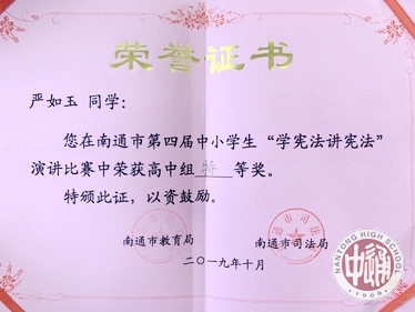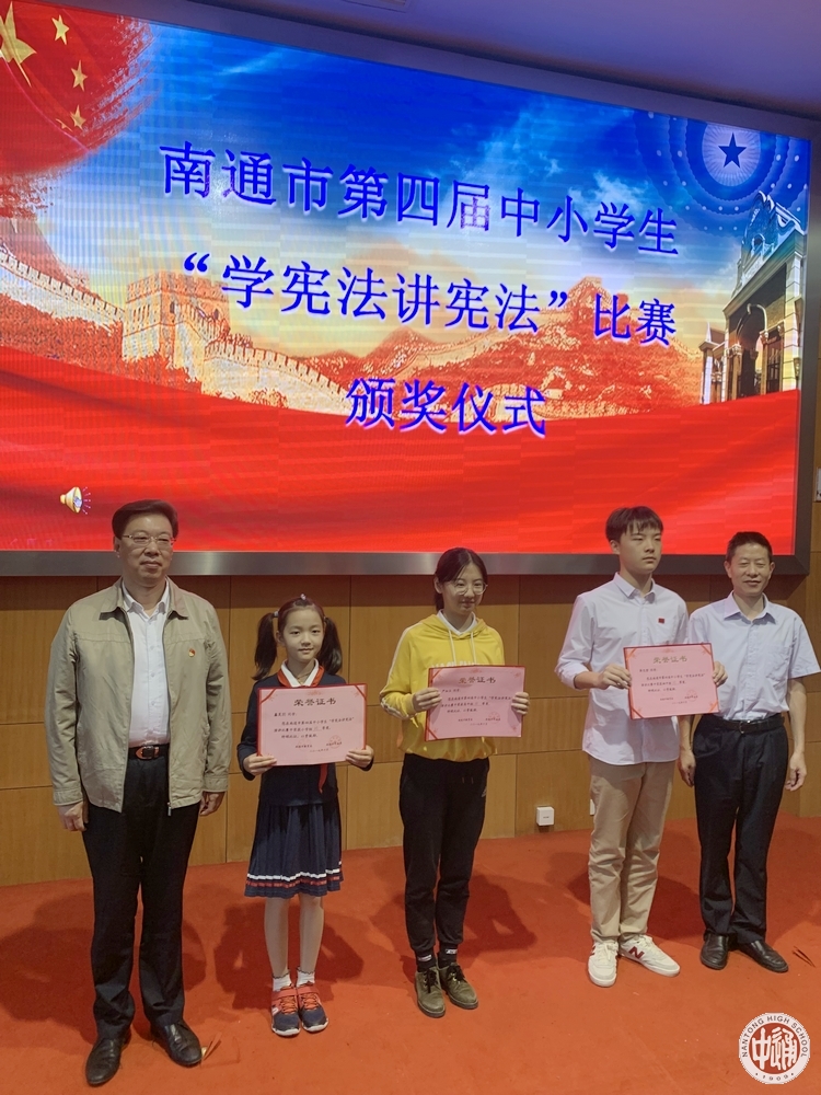 近年来,我校学子在学宪法讲宪法赛事上的连续优异表现也再次证明了学校在宪法普及宣传方面所做的工作扎实有力。通中学子在课堂学习和课外实践中充分认识到宪法在日常生活中的积极作用,也有信心共同承担起维护宪法尊严、保证宪法实施的神圣职责!接下来,严如玉同学也将代表南通市参加省赛的选拔,希望她能继16年卢芳菲同学、18年吴雨遥同学获得全国“学宪法 讲宪法”比赛一等奖后,再次在国赛中为学校赢得佳绩。