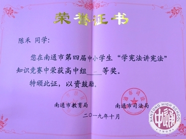 10月8日至9日,南通市第四届中小学生“学宪法讲宪法”比赛在第二初级中学举行。我校高一(5)班陈禾同学、高二(13)班严如玉同学参加了高中组的角逐。此次比赛分法治知识竞赛和演讲比赛两个部分,其中演讲比赛又分主题演讲和现场抽题演讲两个环节。