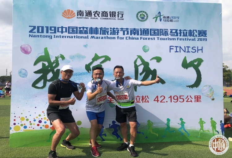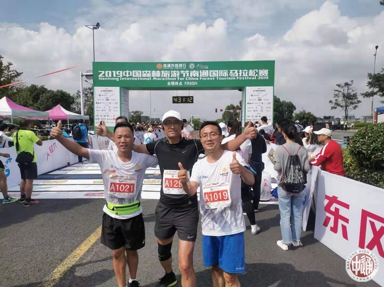 我校作为“国家级体育传统项目学校”、“全国群众体育运动先进学校”高度重视,积极发动教职员工参赛。学校党政办副主任、政治学科蒋卫星老师、体育学科徐峰老师、地理学科杨福春老师踊跃报名参加了全程马拉松,体育学科包牧主任和高二(18)班学生包涵参加了亲子欢乐跑。我校三位全程马拉松选手在全程42.195公里的速度和耐力的比拼中,互相鼓劲,互相勉励,始终保持昂扬的斗志和顽强的意志,最终均以4小时29分的净声成绩圆满完赛。南通中学的运动达人们也积极赶赴现场,为我校参赛选手呐喊助威、热忱服务,体现了良好的团队合作精神。