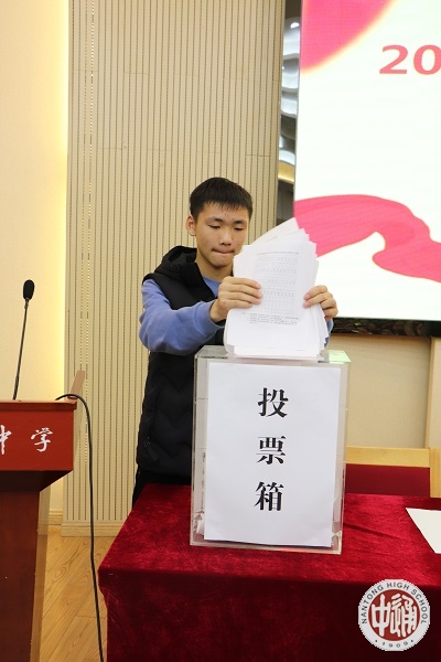 随后进入投票环节,现场观摩的同学们充分行使权利,认真权衡心仪人选,最终投出自己宝贵的一票。现场高二年级学生会和团总支的工作人员监督了整个选举过程,并对所有选票进行了回收清点。