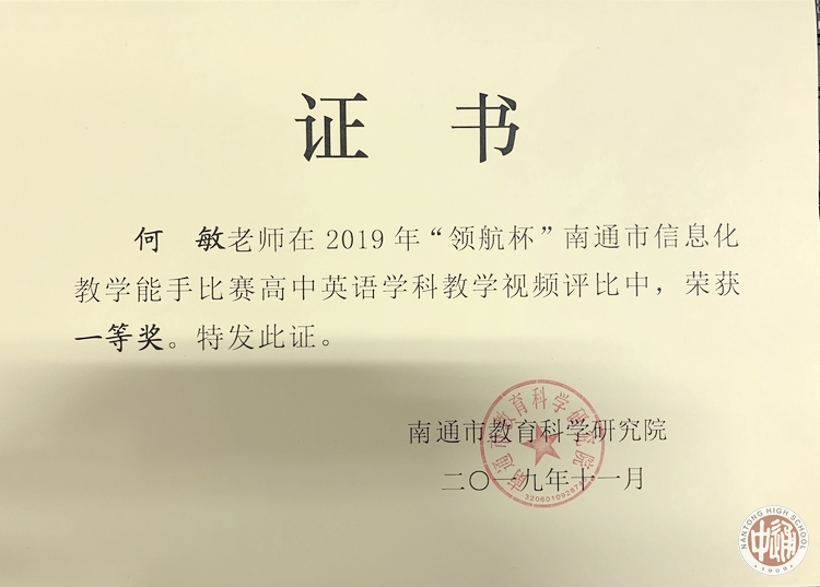 何敏老师获大市信息化教学能手一等奖 来源:本站原创 发布时间:2019-12-05 10:18:39 浏览次数: 次 【字体:小 大】 在刚刚结束的2019年“领航杯”南通市信息化教学能手比赛高中英语学科教学视频评比中,我校英语学科何敏老师在众多的参赛选手中脱颖而出,荣获大市一等奖。(图文:英语学科 责编:顾军 审核:陈建云) 分享到: 【打印正文】