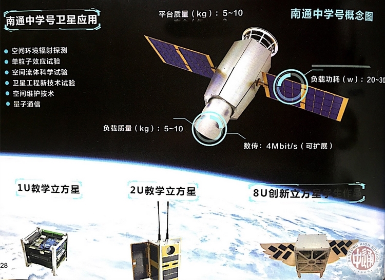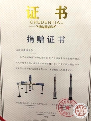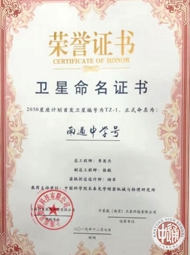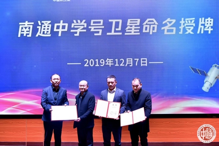 命名仪式上,国内知名航天企业上海蔚星公司、中星航(南京)卫星科技公司联合向南通中学颁发了“南通中学号”卫星命名证书和捐赠证书,我校党委书记陈文辉代表学校接受了证书。按照计划 “南通中学号”卫星将于2020年下半年择机发射,轨道高度为700公里,主要功能为对地观测,包括对特殊气象和极光的观测,幅宽100KM,分辨率15m。