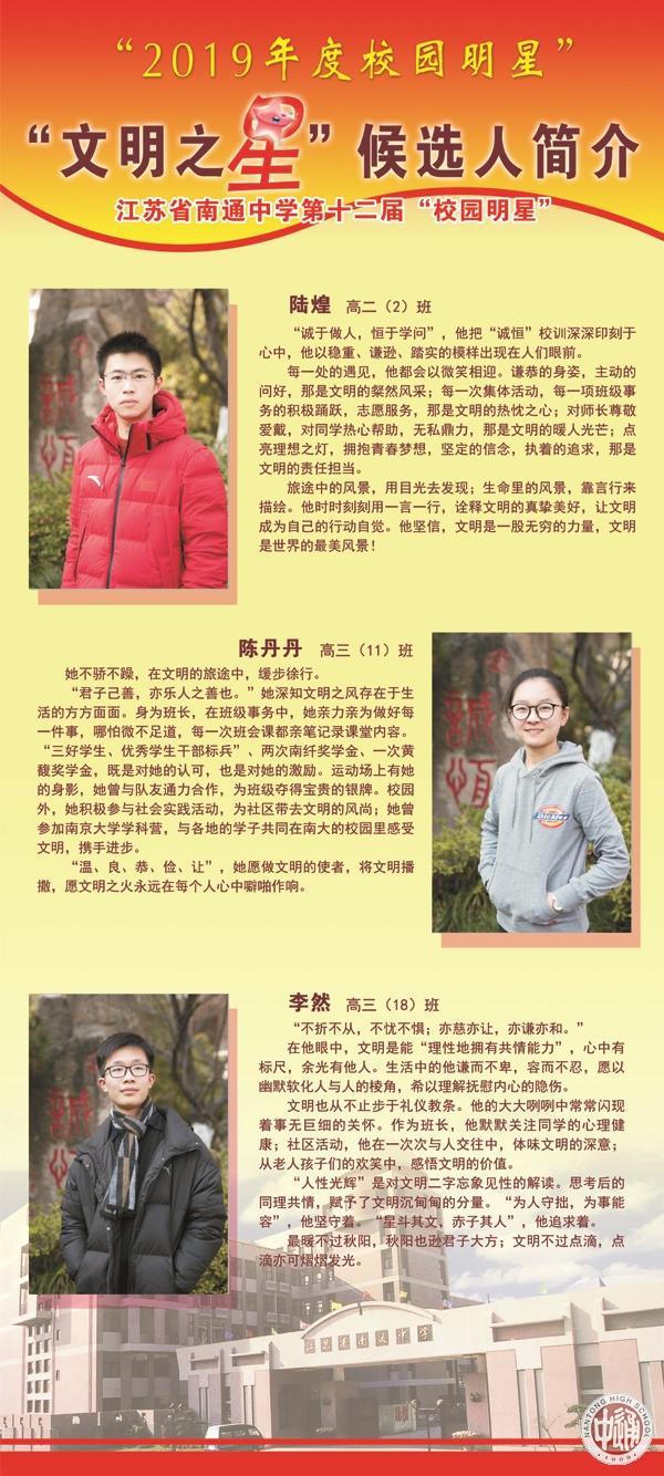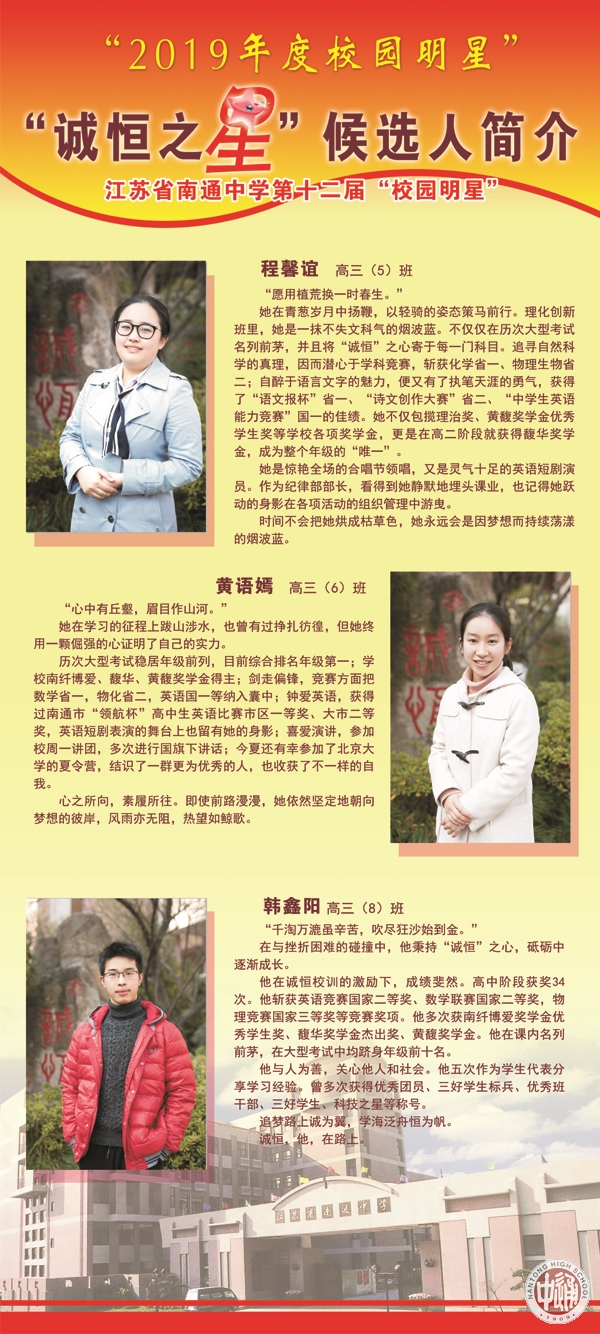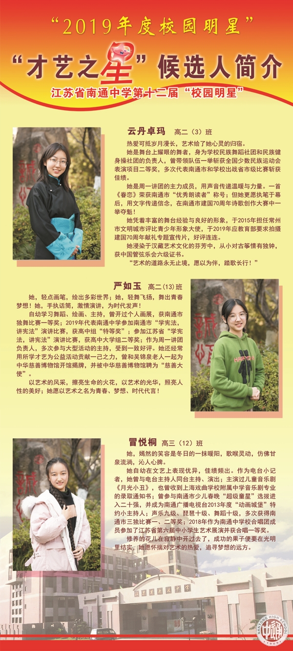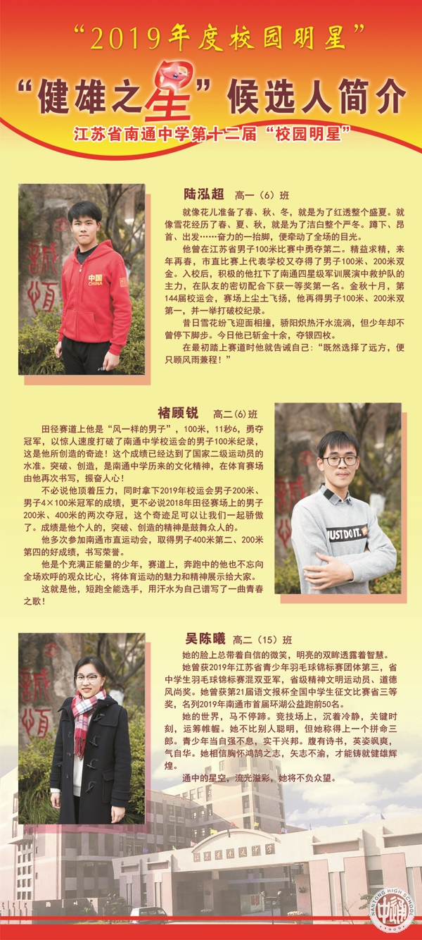 2019年度“校园明星”评选拉开帷幕 来源:学生处 发布时间:2019-12-18 12:39:09 浏览次数: 次 【字体:小 大】 一年一度的通中校园明星评选拉开帷幕,三十位校园明星候选人已经产生,将经过投票最终确定10位校园明星。自2007年末以来,我校校园明星的评选已经走过12个年头。今年,我校将继续采用线上和线下两种投票方式。让我们一起来看看榜样的风采,共同期待12月31日下午颁奖盛典的到来。 分享到: 【打印正文】