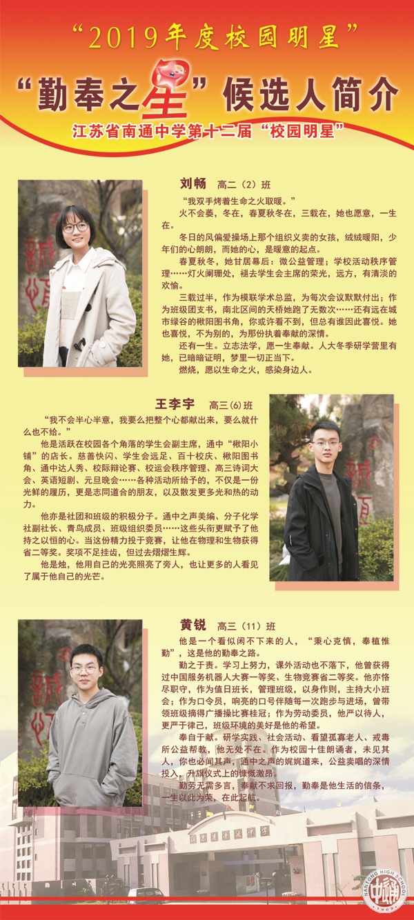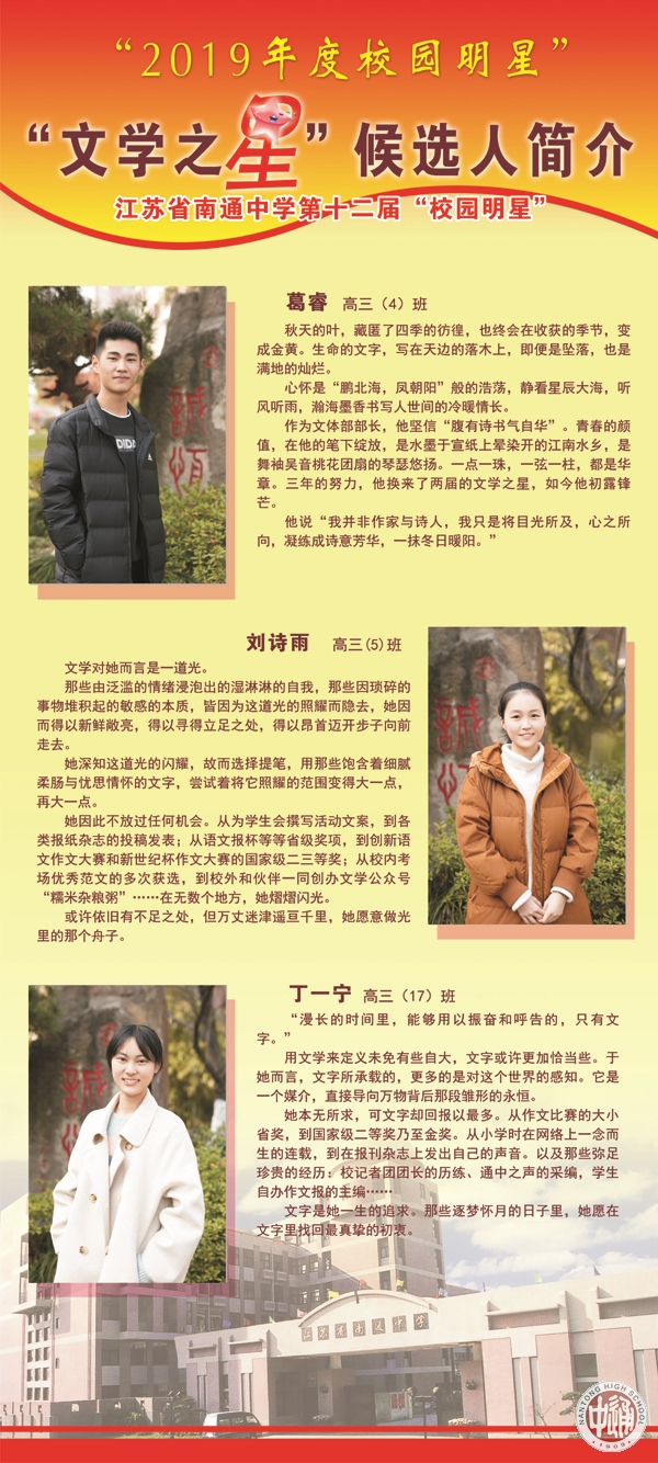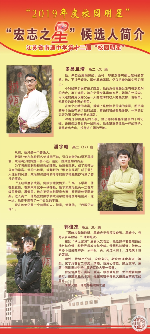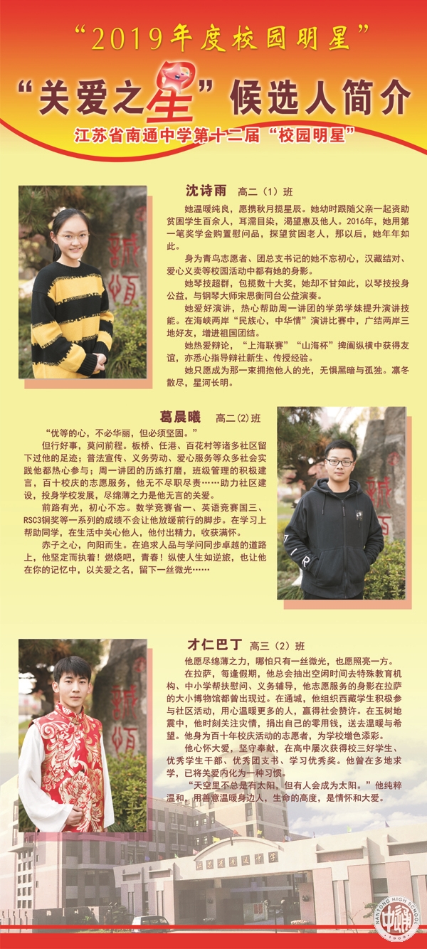 2019年度“校园明星”评选拉开帷幕 来源:学生处 发布时间:2019-12-18 12:39:09 浏览次数: 次 【字体:小 大】 一年一度的通中校园明星评选拉开帷幕,三十位校园明星候选人已经产生,将经过投票最终确定10位校园明星。自2007年末以来,我校校园明星的评选已经走过12个年头。今年,我校将继续采用线上和线下两种投票方式。让我们一起来看看榜样的风采,共同期待12月31日下午颁奖盛典的到来。 分享到: 【打印正文】