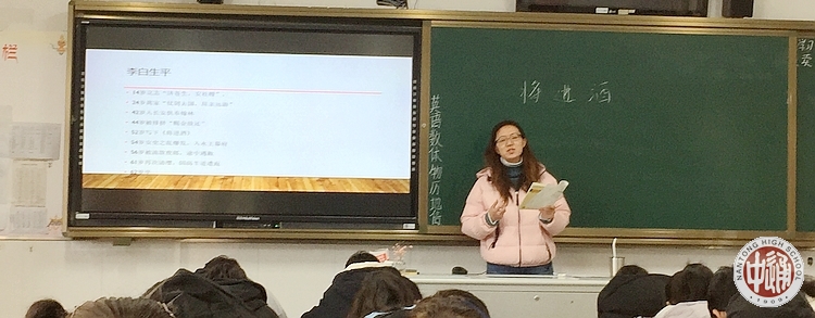 12月27日上午第二课,丁洪晶老师开设了“难忘课堂”研讨课——李白《将进酒》。备课组当堂无课的老师参加了听课、评课活动。