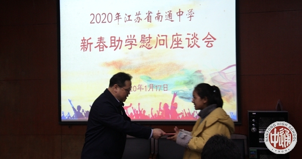 活动由学生处副主任邬云琰主持,沈惠祥副校长到会为学生一一颁发慰问金,沈校长首先向在座学生及家长致以新春最美好的祝愿,祝愿所有同学学业进步,家庭幸福、万事如意,他希望在座学生及家庭能直面眼前暂时的困难,在各界的关心和支持下,逆境中奋发图强,以实际行动努力成才,报效社会,回报通中,回报家庭。