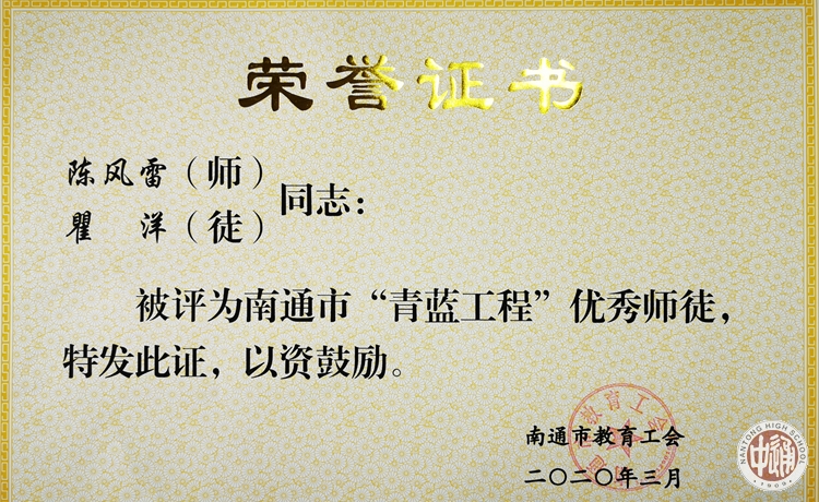 在刚刚结束的南通市“青蓝工程”优秀师徒评比活动中,我校陈风雷(师)、瞿洋(徒)两位老师获2019年度市“青蓝工程”优秀师徒称号。
