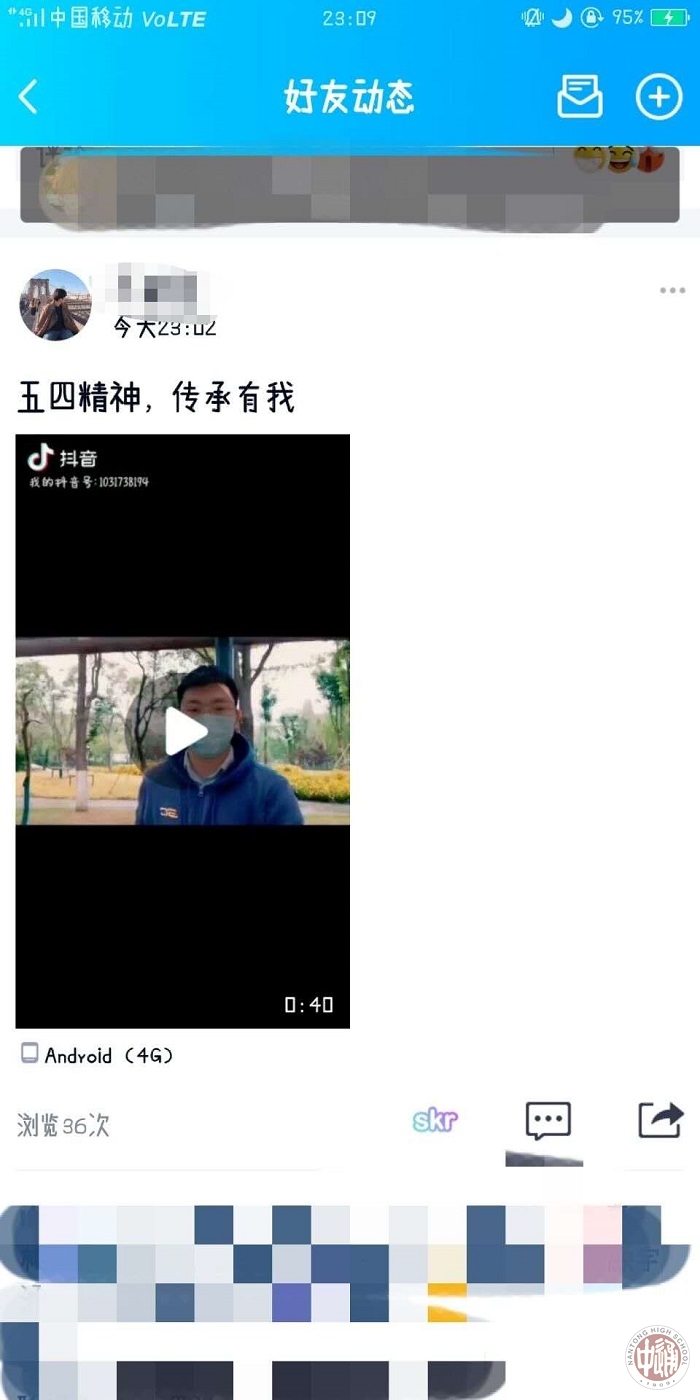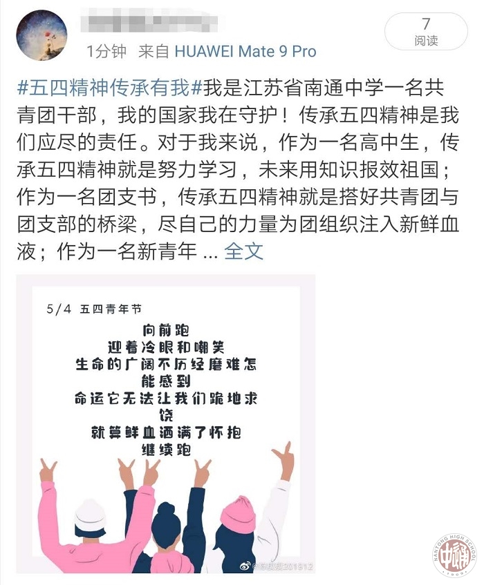 今年五四期间,通中广大团员青年也积极响应团中央号召,除了举行相关主题教育活动以外,全校各支部以及在各级各类评比中获得荣誉的优秀团员、优秀团干部还积极参与到“五四精神·传承有我”的主题网络互动活动中去,通过制作海报、漫画、留言等形式,在微博、微信、B站、QQ空间、抖音等网络平台@共青团中央参与话题互动,展示当代青年积极进取的精神风貌,弘扬五四正能量。