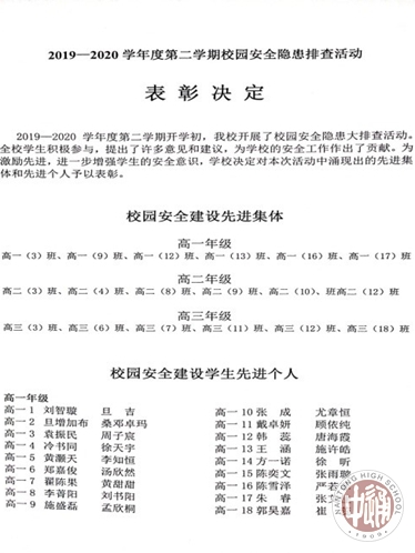 针对本次校园安全隐患排查活动中涌现出的优秀班级和学生,学校评定了校园安全建设先进班集体共 18个,校园安全建设先进学生110人。