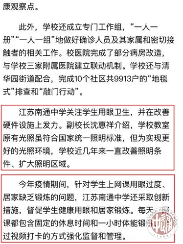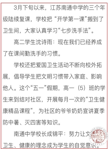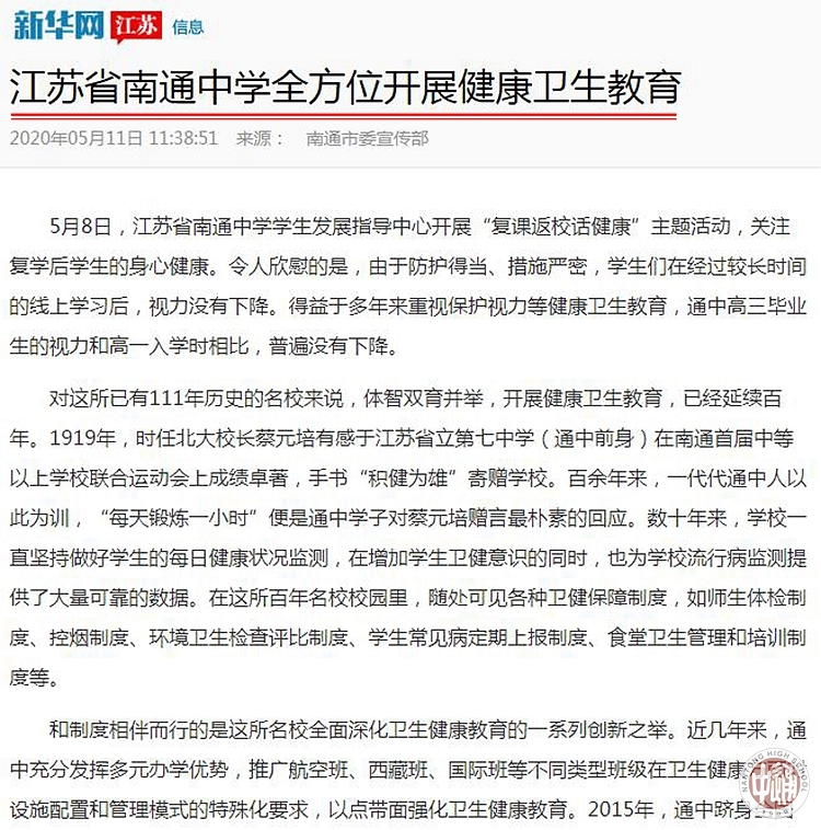 5月11日,新华网江苏频道刊发了中共南通市委宣传部组织撰写的专题文章《江苏省南通中学全方位开展健康卫生教育 》,全面系统介绍了我校深化卫生健康教育的一系列创新之举,尤其是重点介绍了我校充分发挥多元办学优势,推广航空班、西藏班、国际班等不同类型班级在卫生健康方面对设施配置和管理模式的特殊化要求,以点带面强化卫生健康教育。
