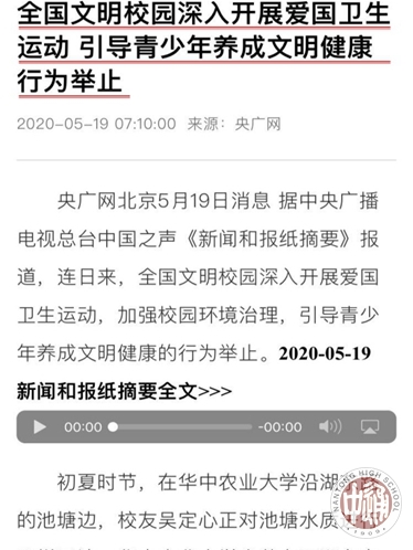 根据中央领导同志指示精神和上级部门要求,5月12日,新华社记者杨丁淼专程赶赴我校,实地调研我校的健康卫生教育情况,并与成锦平校长及分管健康卫生教育的沈惠祥副校长进行了深入交流。杨记者对我校高度重视健康卫生的悠久传统、疫情防控背景下的特色做法表示由衷赞赏,并撰写专题报道《营造美丽校园 卫生健康先行---全国文明校园爱国卫生运动见闻》于5月14日刊发在新华网。
