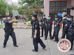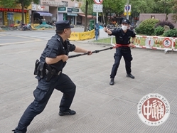 在演练实操培训中,巡特警梁家辉警官向大家详细介绍了防暴盾、防暴钢叉、橡胶警棍、催泪剂等器械的性能,重点示范了如何熟练地使用这些防暴防恐器械。在巡特警的指导下,学校安保人员开展了模拟演练,强化了当有不法分子扰乱和冲击学校秩序时操作防恐防暴器械将其迅速制服的应急处置流程。