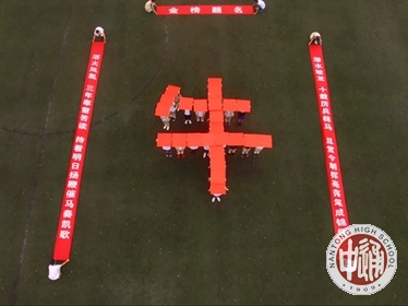 高一学生会的同学们提前在操场上录制的“云喊楼”视频也在“云升旗仪式”上呈现。在无人机的俯拍镜头下,他们用红色纸板组成“牛”字的造型,伴随着“攒足牛劲,冲向辉煌,所向披靡,牛气冲天” 的响亮口号,左右两侧长约9米的一副对联徐徐展开,上联:潜水蛟龙,十载厉兵秣马,且赏今朝挥毫落笔成锦绣;下联:浴火凤凰,三年寒窗苦读,待看明日奋蹄扬鞭奏凯歌;横批:金榜题名。精心的设计,响亮的口号,传递着学弟学妹们的满腔热情,也使得高三学子在紧张备考中能释放压力,提振信心。