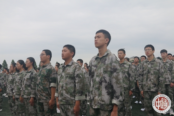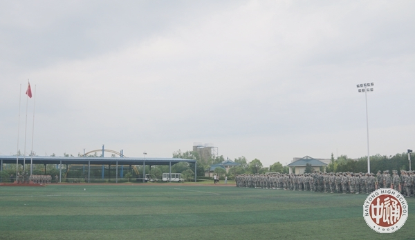 升国旗、奏国歌,全体高一新生响亮的国歌声响彻云霄。护旗队同学手握步枪,护送军训队旗和“江苏省南通中学”巨幅校旗从列队和司令台前铿锵走过。
