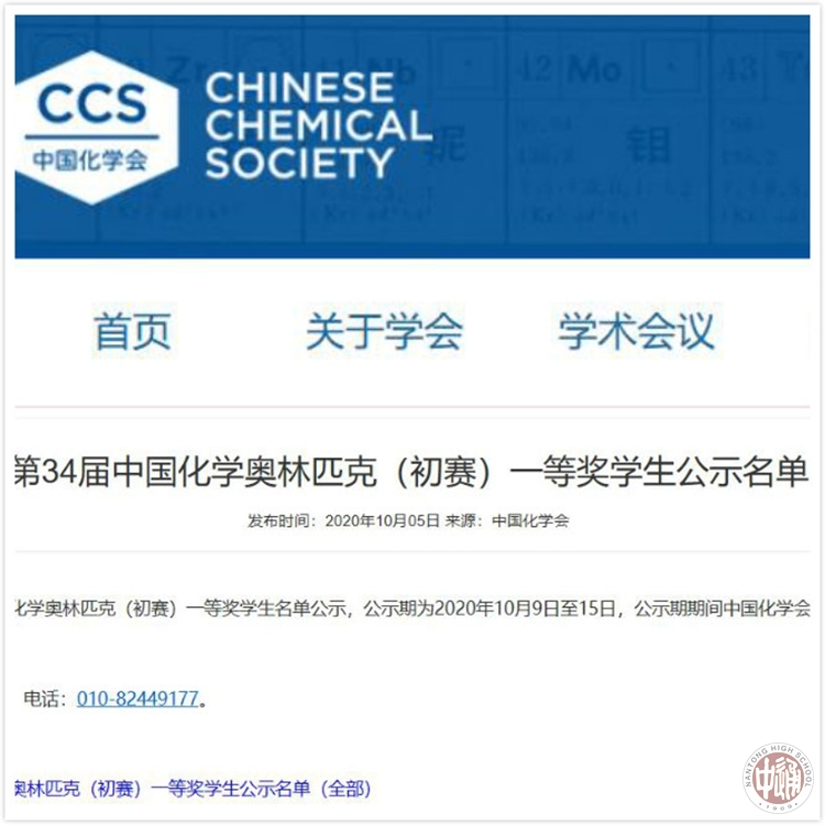 近日,中国化学会官网上公示了“第34届中国化学奥林匹克(初赛)”一等奖学生名单,南通中学高三创新班陈祎楠、高二创新班朱炎两位同学榜上有名!在此,向获奖同学表示热烈祝贺!
