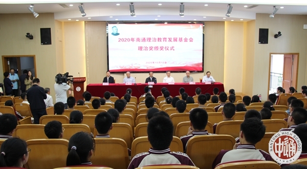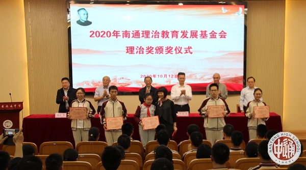 10月12日下午, 2020年南通理治教育发展基金会“理治奖”颁发仪式在南通中学科学楼三楼报告厅举行。朱理治之子、原中国社会科学院副院长、南通理治教育发展基金会管理委员会会长朱佳木,南通市教育局局长郭毅浩,南通理治教育发展基金会理事长季军、南通中学党委书记鞠九兵等领导出席颁奖仪式。通中和通师一附两校一百多名师生代表到场观摩。仪式由南通中学副校长沈惠祥主持。