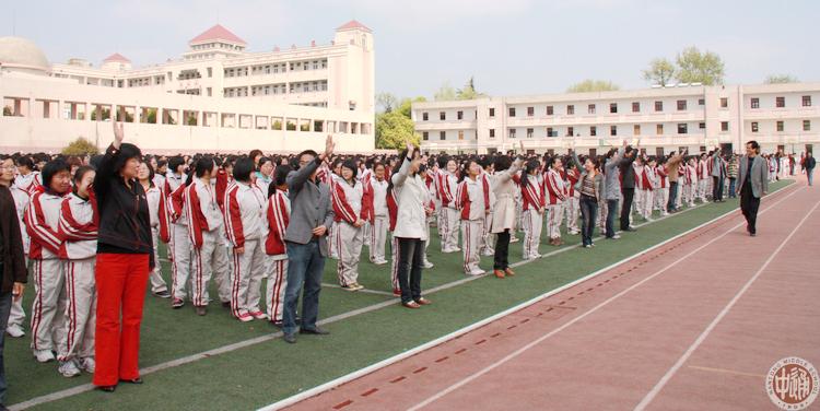 下图班主任向校长姚天勇举手示意全班学生安全抵达操场。