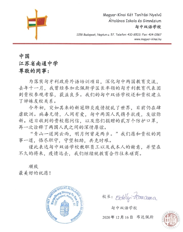 12月16日,匈牙利布达佩斯匈中双语学校向我校发来感谢信,诚挚感谢我校在新冠疫情肆虐欧洲之时伸出温暖援助之手,再一次诠释了国际姊妹友好学校、以及中匈两国人民之间的深厚情谊。