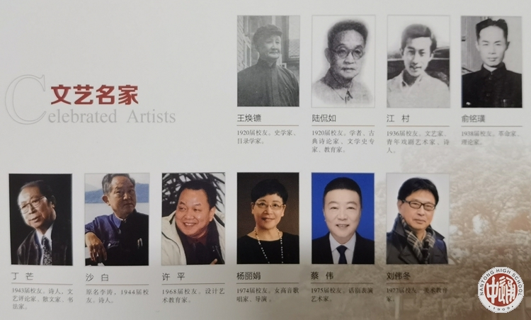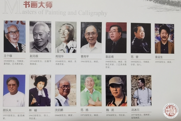 在“美乐相谐”的美育思想的孕育中,通中历届校友中涌现出以赵无极、王个簃、高冠华、范曾、袁运甫、袁运生、范扬为代表的十数位书画大家,以陆侃如、丁芒为代表的文艺名家,以央视著名主持人王梁为代表的一大批新生代杰出传媒人。