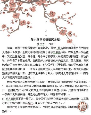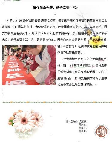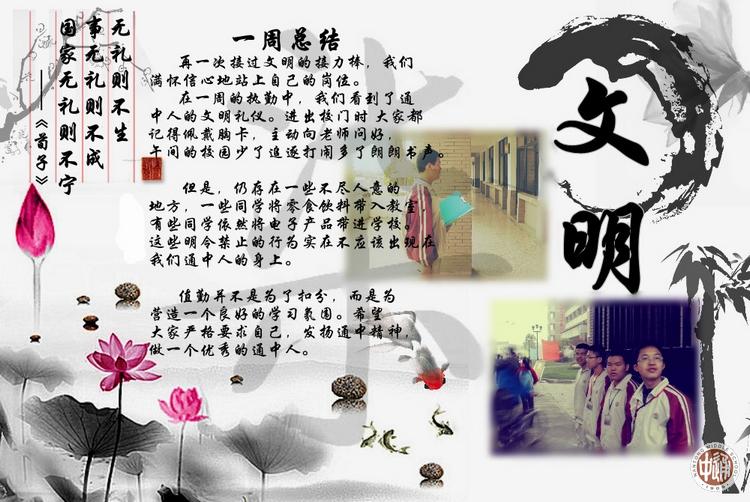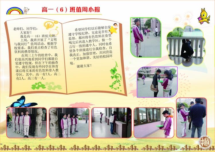 【编者按】校团委主编的《文明月刊》和各周文明值日班级的《值周小报》是我校开展文明活动的传统项目。多年来,通过《文明月刊》和《值周小报》,各班的活动得到充分交流,好人好事得到表彰,各种活动创意激发了各年级学生开展文明活动的主动性和积极性。本版展示的是刚刚编辑发行的今年第4期《文明月刊》,以及高一6班和7班4月份的《值周小报》。