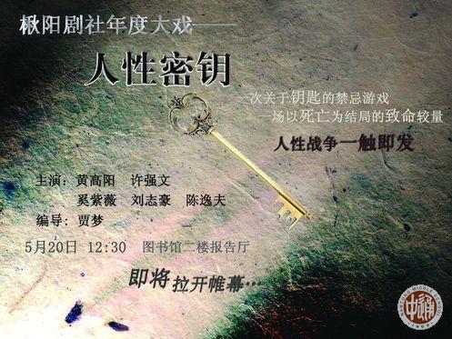 5月20日中午,我校学生社团楸阳剧社在图书馆报告厅举行年度大戏汇演。下图是贴在校园内公告栏的《献给迪利亚的玫瑰》和《人性密钥》两个话剧的广告。