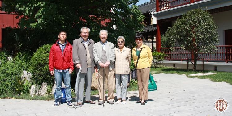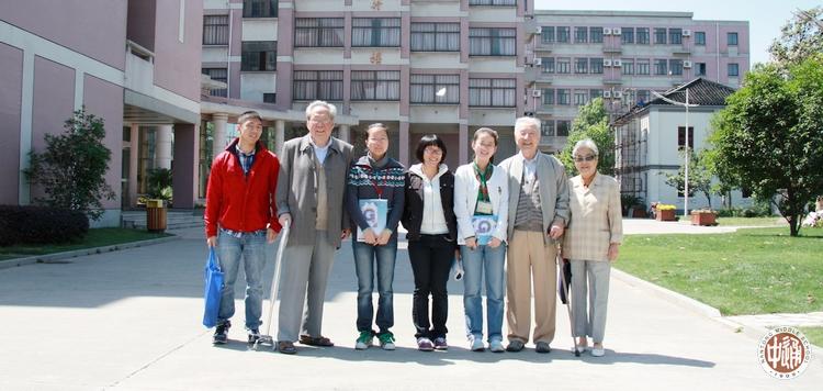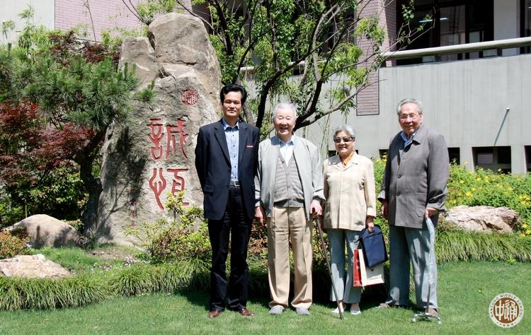 上图我校校长姚天勇怀着崇敬的心情在“诚恒”校训石前与三位老前辈合影留念,下图是三老与陪同来访的刘老的女儿和钱老的外孙在被称作“通中之魂”的600年老楸树下留影。