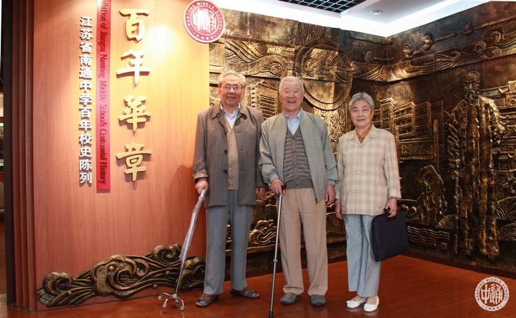 下图是刘老(中)参观通中百年校史陈列馆时与夫人(右)和陪同来访的大学同学钱老(左)在馆标“百年华章”前合影。