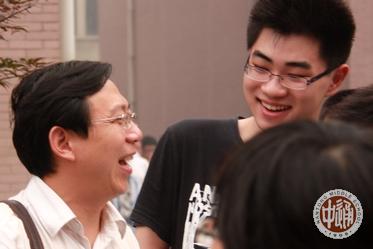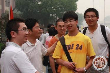 下面两图通中学子正向送考的班主任老师汇报自己的考试情况,此时此刻师生灿烂的笑容分外感人。