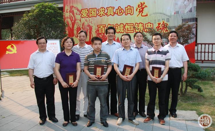 纪念活动由校长、党委副书记姚天勇主持。学生工作支部、政史地学科支部、崇海高中支部和离退休教工支部在本次活动中受到表彰,并获得校党委命名的“先进党支部”称号。下图是校领导和校党委委员与受表彰的支部代表的合影。