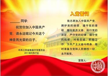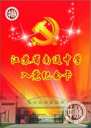 上图市教育局纪工委书记张建跃到会向学生新党员赠送入党纪念卡。下图是入党纪念卡正面和内页图文。