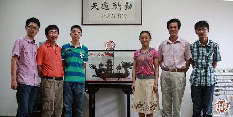 座谈会后,部分参会学生与校长姚天勇、教务处分管本届高三年级的副主任兼高三年级主任钱明华老师在本届毕业生赠送给母校的木雕龙舟“乘风破浪”纪念物前合影留念(下图)。
