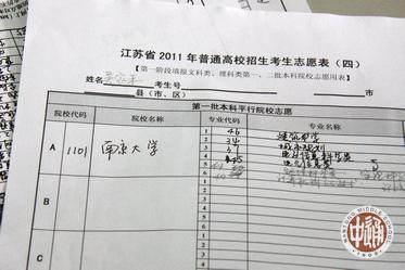 上图是我校考生集中在学校电脑房填报志愿的镜头。老师身后居中身着白色T恤的男生吴家禾(左下图)填写的志愿表(右下)是本届考生填报志愿的一个有趣花絮。他是与南京大学签约的特长生,按照约定只要高考分达到本一线就可被南京大学录取。巧的是,该生高考成绩丝毫不差地正好达线,所以他的志愿表只须填写南京大学即可。更巧的是,他参加高考所在考场正是他本人原来的教室,而且他的高考座位正是他本人平时的座位。因此他从同学们那儿得到个“幸运帝”的美称。
