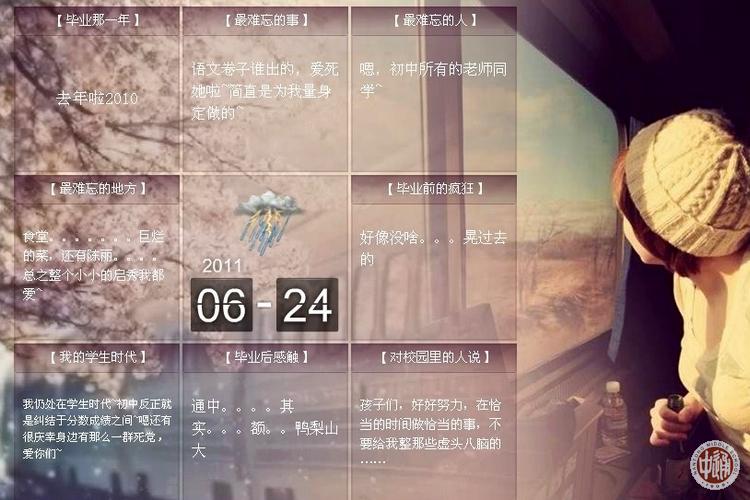 【编者按】这里发布是高一年级女生彭单怡QQ空间6月24日的日志,标题《初中毕业那年》。编者选中这篇,是特地为迎接今年高一新生而编发的。彭的空间有一个诗句般美丽的名称《怡,面朝大海,春暖花开》,日记页面也像诗一般浪漫,所以编者没有另做加工,直接截屏转帖在这里了。